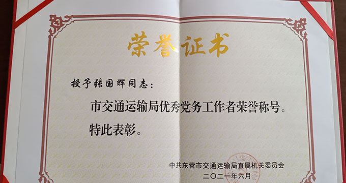 張國(guó)輝榮獲“市交通運(yùn)輸局優(yōu)秀黨務(wù)工作者”