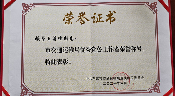 王清峰榮獲“市交通運(yùn)輸局優(yōu)秀黨務(wù)工作者”